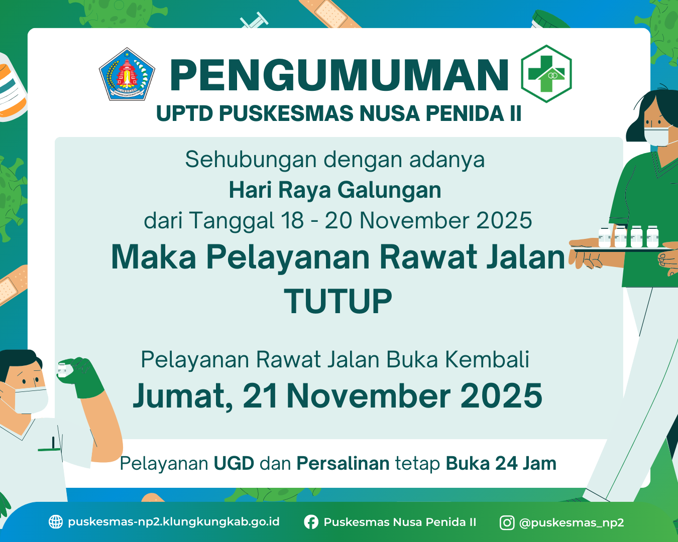 Halo Sahabat UPTD. Puskesmas Nusa Penida II. Mohon Permakluman, sehubungan dengan adanya Hari Raya Suci Galungan dari tanggal 18 – 20 November 2025. Maka Pelayanan Kesehatan Rawat Jalan TUTUP Pelayanan Rawat Jalan Buka Kembali Pada Hari Jumat, 21 November 2025 *Pelayanan Unit Gawat Darurat (UGD) dan Persalinan Tetap Buka 24 Jam. Terima Kasih